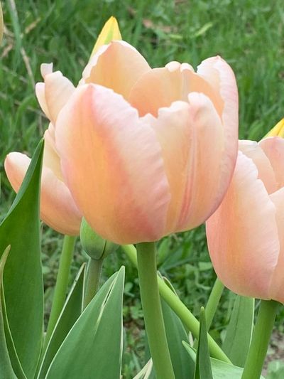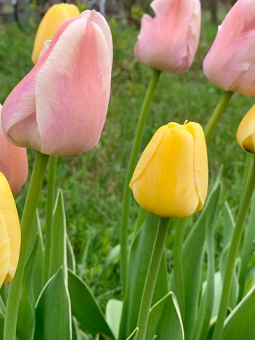 Stunning combination of blush and butter yellow blooms on very tall, sturdy stems. Yellow tulips have striking variegated foliage for added garden interest. Great for larger landscapes and mixed bulb plantings.